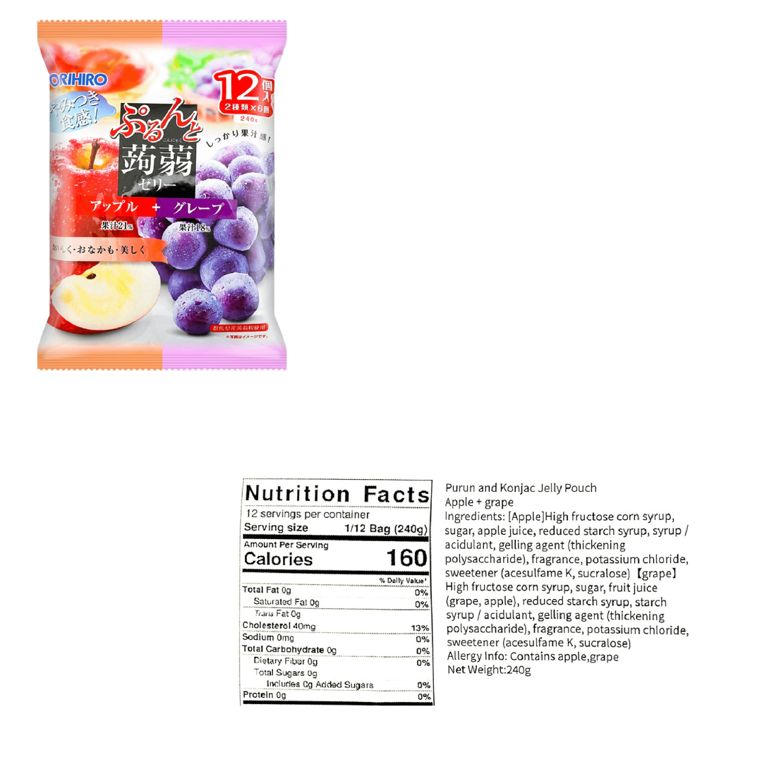Orihiro Purunto Konjac Jelly Apple and Grape combines the refreshing flavors of apple and grape in a low-calorie, generous pack size. Perfect for a healthy and delicious snack